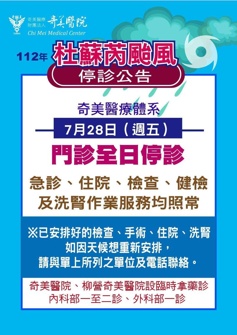 配合台南市政府宣布今(28)日停止上班上課,奇美醫療體系今日門診也停診。(圖由奇美醫院提供)
