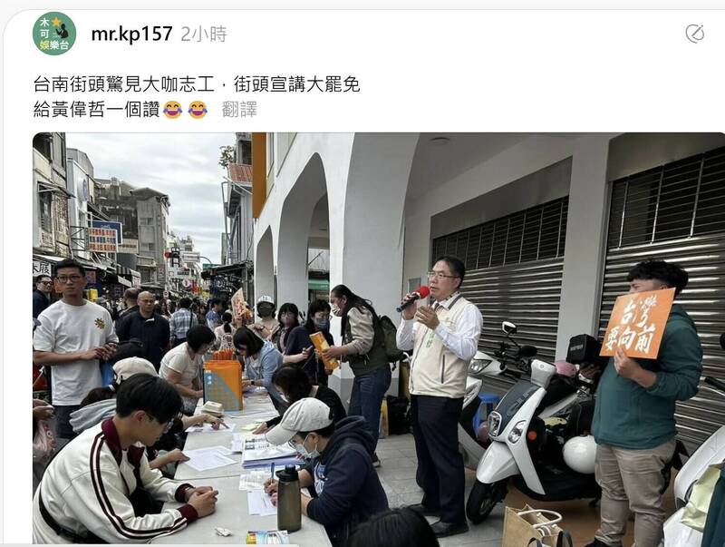 「全台大罷免」連署聲援已在台南各地響起,台南市長黃偉哲今(3)日現身中西區國華街的民主連署站宣講,網友發現後大讚留言「這個志工太重量級了」、「太厲害了」!