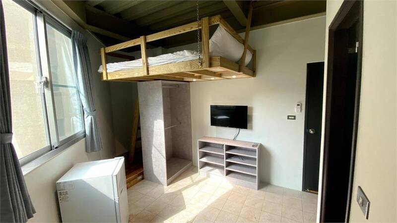 從照片顯示,整間套放裡最吸睛的設備,莫過於給租客睡覺用的床鋪,因為它被鐵鍊吊於天花板、下方則有櫃子頂住床底,由於床體是懸浮在空中,因此房內的小角落附有一個梯子,方便租客上下爬床。對此,原PO忍不住吐槽,這個設計宛如遊樂設施,現在的套房競爭是不是很大?都會附設遊樂設施?比如這間是海盜船風格?