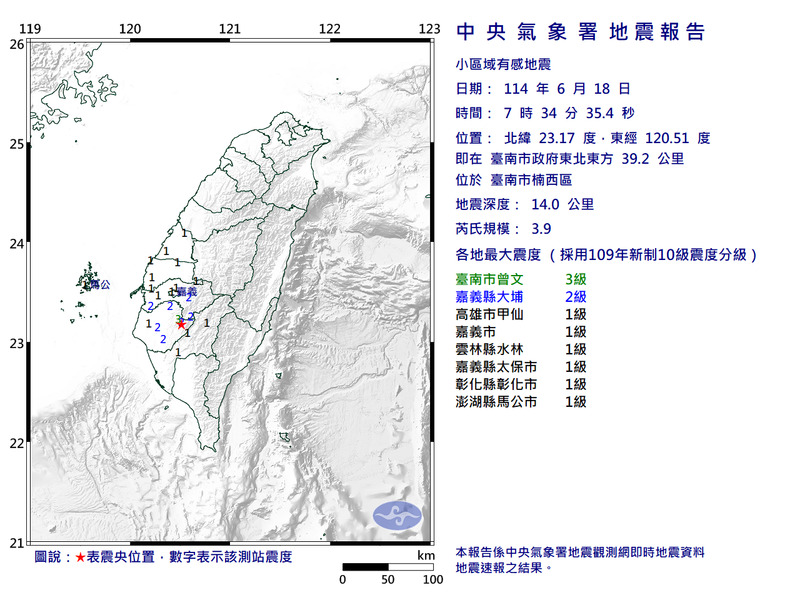 根據中央氣象署資料顯示,今天清晨07時34分在台南市楠西區發生芮氏規模3.9地震,地震深度為14公里,震央位於臺南市政府東北東方39.2公里。