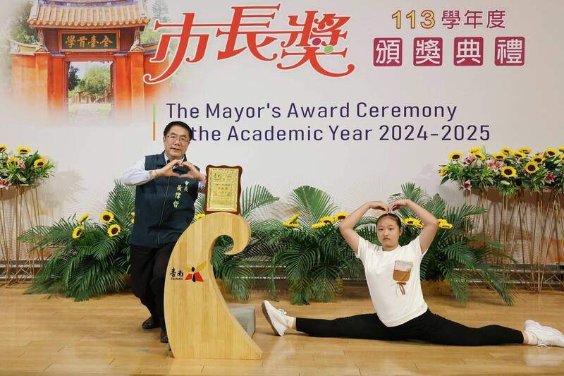 邁入第4年「市長陪你拍」市長獎頒獎典禮,首場次今日下午於慈濟高中活動中心隆重登場,市長黃偉哲與24所國中與補校,共564位市長獎畢業生合照,每位得獎者與市長合照使出渾身解數,包括往年常見一字馬、劈腿、下腰,也有得獎者獻吻,或穿上向市長借用的背心,甚至背起市長也不少見,種種創意讓現場歡笑、驚呼聲不斷。