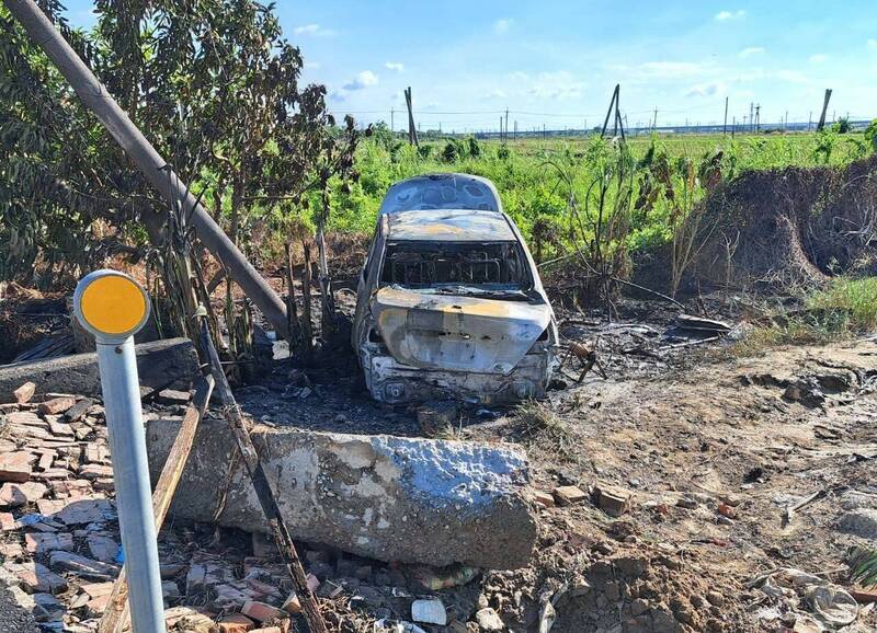 1輛轎車疑自撞護欄後衝至南85線旁農地,車子起火全面燃燒,只剩骨架,幸好車上3人逃生。(民眾提供)