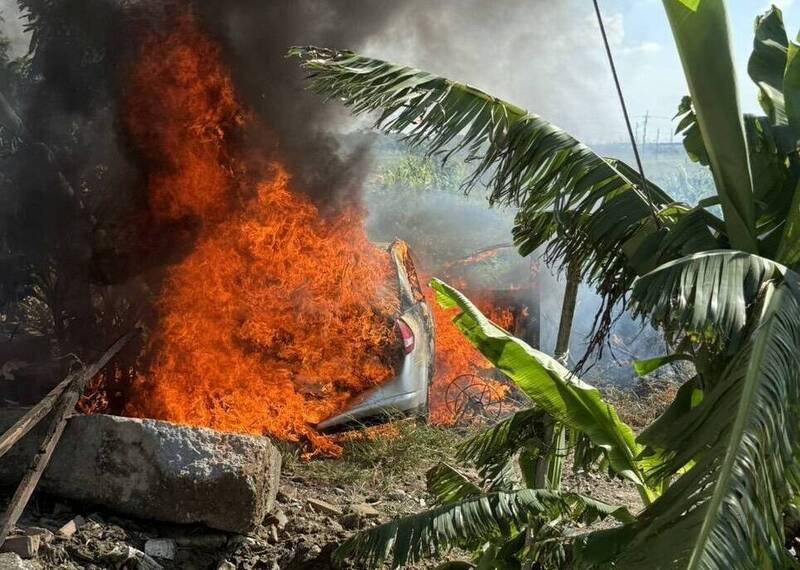 轎車衝至路外農地起火燃燒,火勢凶猛。(民眾提供)