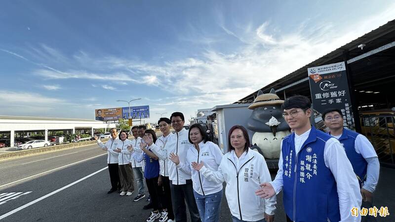 國民黨立委謝龍介(右四)今在多位黨籍市議員陪同下,在首面大型看板前,呼籲市民接到民進黨初選民調電話時,回答「唯一支持謝龍介」。(記者劉婉君攝)