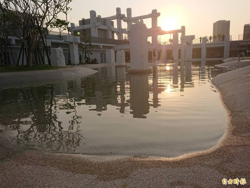 夕照河樂廣場,倒影之美。(記者洪瑞琴攝)