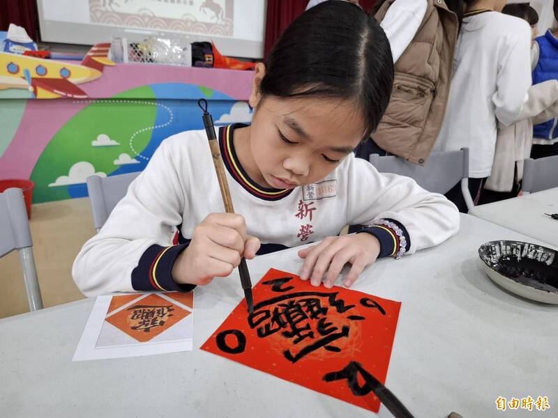 迎接農曆新年,新營國小舉辦「墨香迎春、揮毫納福」師生寫春聯體驗活動。(記者王涵平攝)