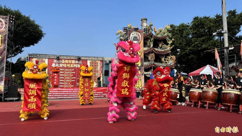 「大台南囝仔仙拚仙」由鹽水國中、歡雅國小與岸內國小3校跨校組成舞獅進行開幕表演。(記者楊金城攝)