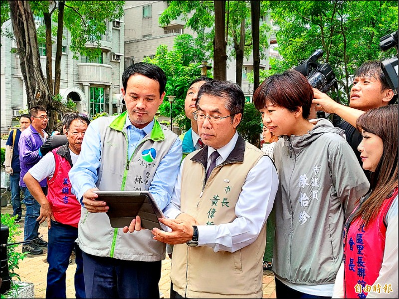 透過空拍機傳輸的畫面了解屋頂孳生源死角後,台南市長黃偉哲說,現在又有颱風接近,必須努力做好孳清的工作。(記者蔡文居攝)