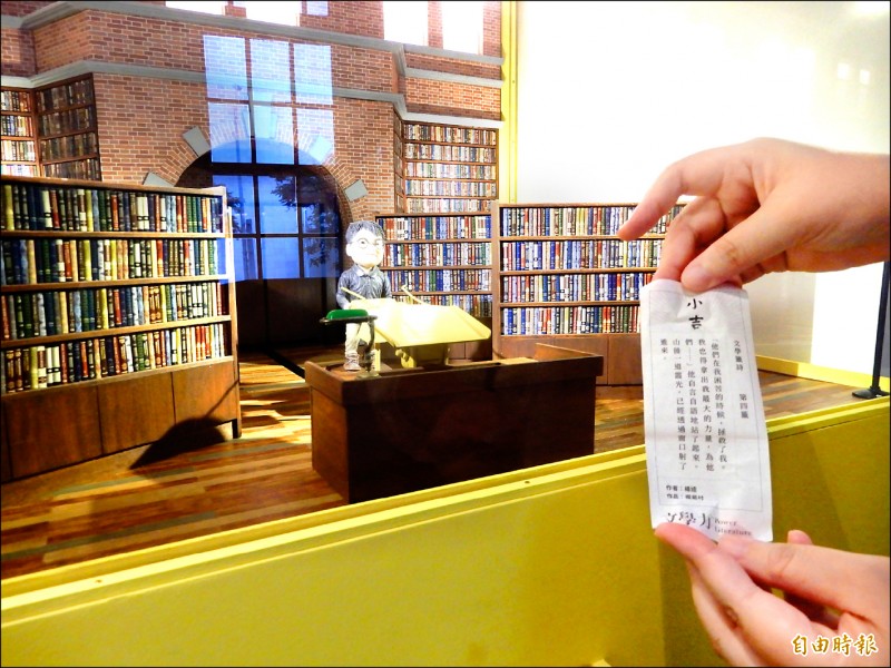 還有作家傾囊解惑的「文學籤詩機」,就像玩抽籤機,隨機按鈕下去,小書僮娃娃送上籤詩,籤詩內容建議你適合看哪些書籍,非常有趣。林姓遊客說,抽籤詩來看書,好玩有創意,籤詩還可以帶回家作紀念。