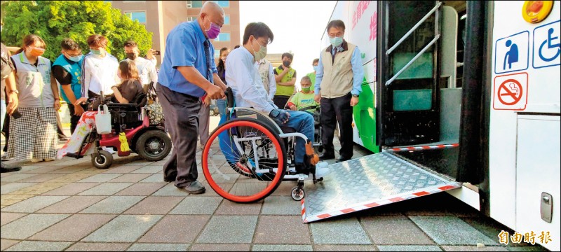 市長黃偉哲(右一)邀請身障團體代表實測大台南公車的無障礙服務。(記者劉婉君攝)
