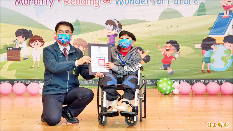 台南市教育局昨天表揚模範兒童,市長黃偉哲(左)頒發獎狀給白河國小陳博勝同學(右)。(記者劉婉君攝)