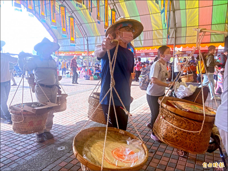 參加擔餅的家庭以扁擔挑著水果餅及幼兒衣鞋子等參拜祈福。(記者劉婉君攝)