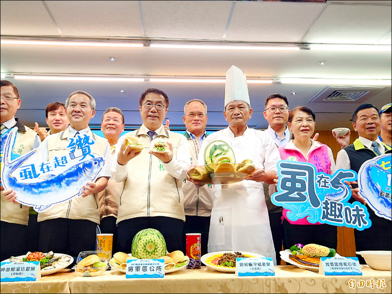 台南市長黃偉哲(前右四)昨日站台宣傳二○二三虱目魚產業文化季,歡迎大家來享用鮮美又有創意虱目魚料理。 (記者洪瑞琴攝)