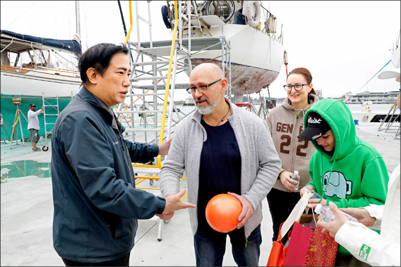 烏克蘭一家三口帆船故障泊安平港修復,新聞處長蘇恩恩(左一)昨日代表市長黃偉哲前往關心。(台南市府提供)