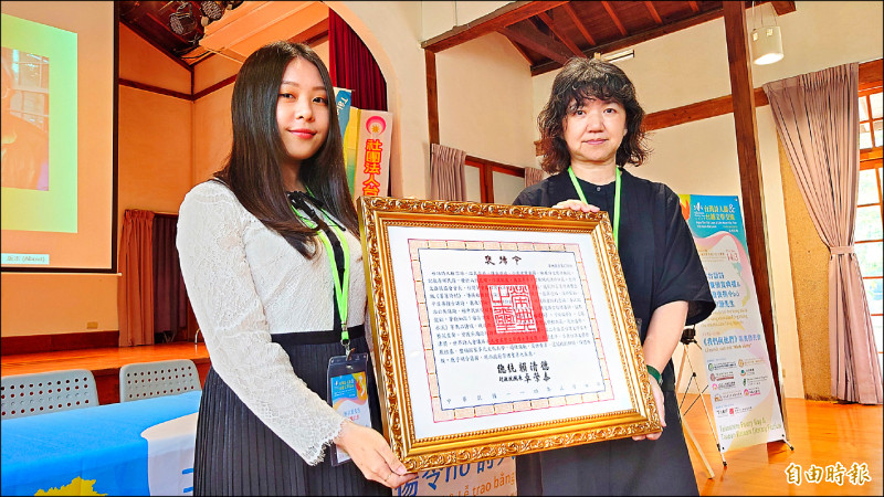 已辭世的台語詩人林宗源獲追頒總統褒揚令,昨在第三屆台灣詩人節,由文化部次長李靜慧(右)代表頒發,林的孫女林憶采代表受贈。(記者洪瑞琴攝)