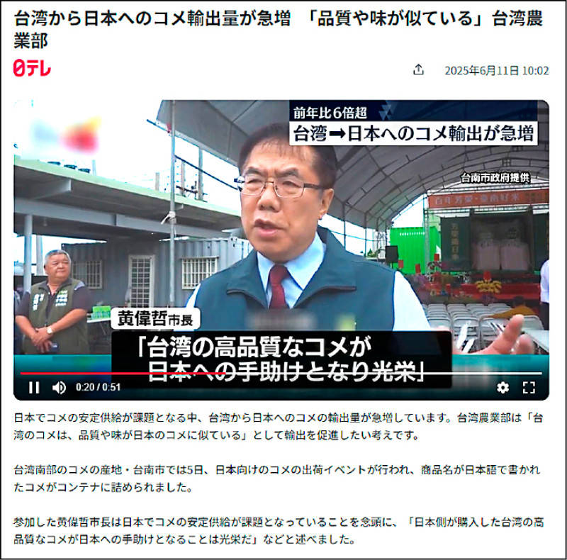 日本電視台引用台南市長黃偉哲的發言表示,「很榮幸日方採購台灣優質米,能對日本有所幫助」。(台南市府提供)