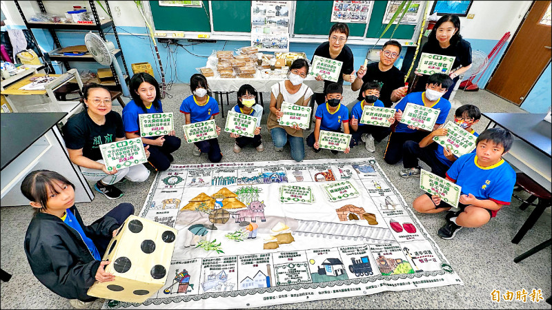 糖業文化桌遊在關廟保東國小舉行發表會,學童體驗放大版的糖業文化桌遊。(記者劉婉君攝)