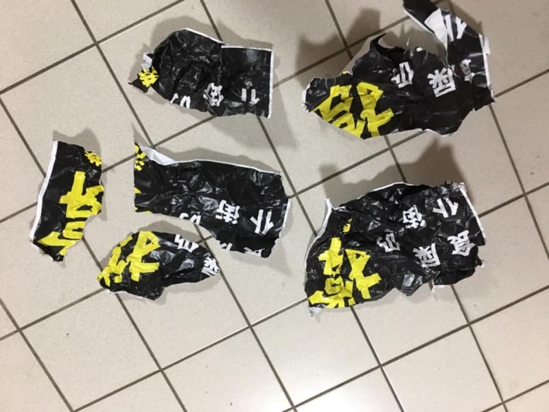 世新大學學生張貼支持香港反送中海報,遭人當場撕毀、丟入垃圾桶。(擷取自臉書)