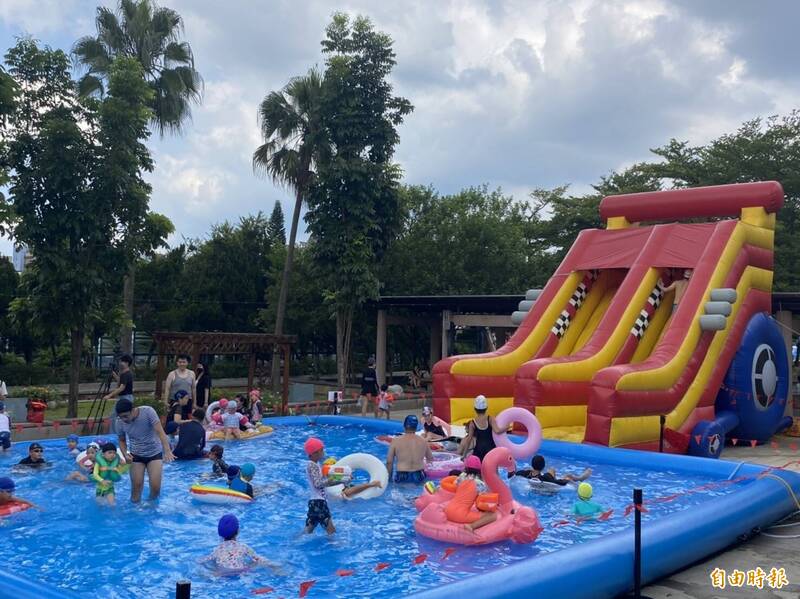 為期9天的「2022台北河岸童樂會-熊讚水樂園」,今在公館自來水園區開幕登場,天氣炎熱吸引許多遊客玩水消暑,70公尺衝鋒滑水道、10公尺天空滑水道,小朋友爭相搶玩、開心直呼好好玩,北市副市長黃珊珊主持開幕儀式表示,自來水園區未來成為北市暑假最重要的活動場地。