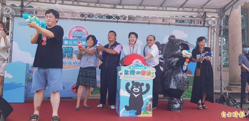 台北河岸童樂會-熊讚水樂園登場,北市副市長黃珊珊(左四)到場主持開幕儀式,北市觀光傳播局長劉奕霆(左一)手持水槍跟民眾同樂。(記者蔡亞樺攝)