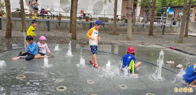 台北市公館地區舉辦的河岸童樂會-熊讚水樂園,小朋友在園區內開心玩水。(記者蔡亞樺攝)
