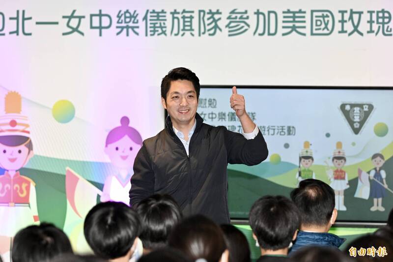 台北市長蔣萬安今(19)日前往北一女中,慰勉訪美並載譽歸國的樂儀旗隊並於活動中致詞。(記者叢昌瑾攝)