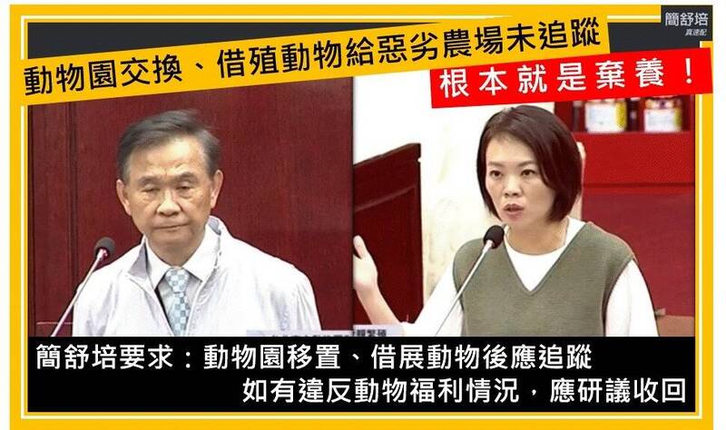 台北市議員簡舒培(右)指出,台北市立動物園交換、借殖動物給惡劣農場為追蹤,砲轟此舉「根本就是棄養」,要求動物園應追蹤移置、借展動物,合作單位如有違反動物福利情況,應研議收回。(取自台北市議員簡舒培臉書)