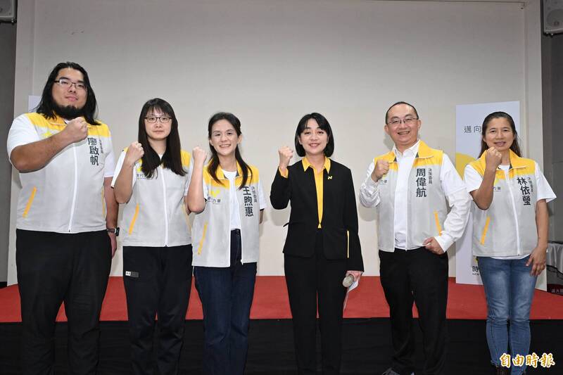 時代力量「時代力量再出發」發表會,時代力量黨主席王婉諭(右3)、決策委員周偉航(右2)、林依瑩(右1)、王煦惠(左3)、廖啟帆(左1)、苗栗縣議員葉忠倫服務處主任吳翌立(左2)。(記者陳逸寬攝)