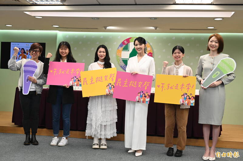 民進黨性平部「妳,就是未來」:民主x女聲 政治影響培力營」發布記者會,並由民進黨性平部李晏榕主任(左一)、嘉義市議員顏翎熹(右三)、山除薇害發言人阿美(左三)、音樂創作人楊舒雅(左二)、民進黨發言人韓瑩(右一)營隊隊輔戴綺儀(右二)分別說明。(記者田裕華攝)
