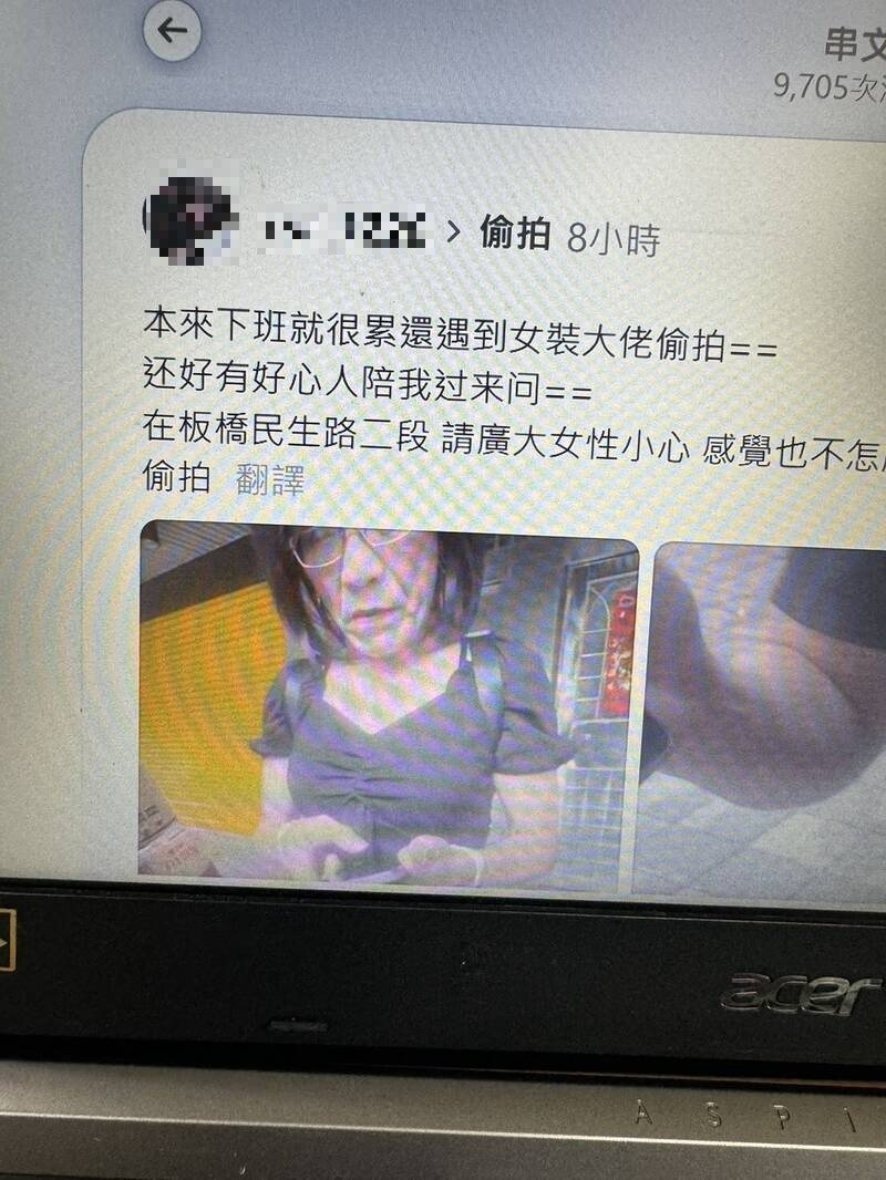 新北市妙齡女今清晨在捷運新埔站旁遭男扮女裝的大佬偷拍裙底,上網提醒大家小心。(記者吳仁捷翻攝)