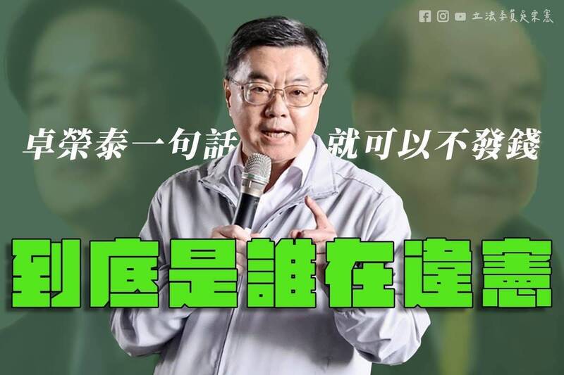 吳宗憲表示,憲法70條是針對「預算案」,立法院不得為增加支出的決議。但特別條例就是「法律案」,卓榮泰居然一句話說違憲,就可以不發了?他是兼任大法官嗎?憑什麼一句違憲就可以不遵守法律?只要憑行政院長一句話,就可以不用遵守民意代表通過的法律,還有依法行政可言嗎?國家好不容易建立起來的權力分立的制度,真的快被民進黨破壞殆盡了。