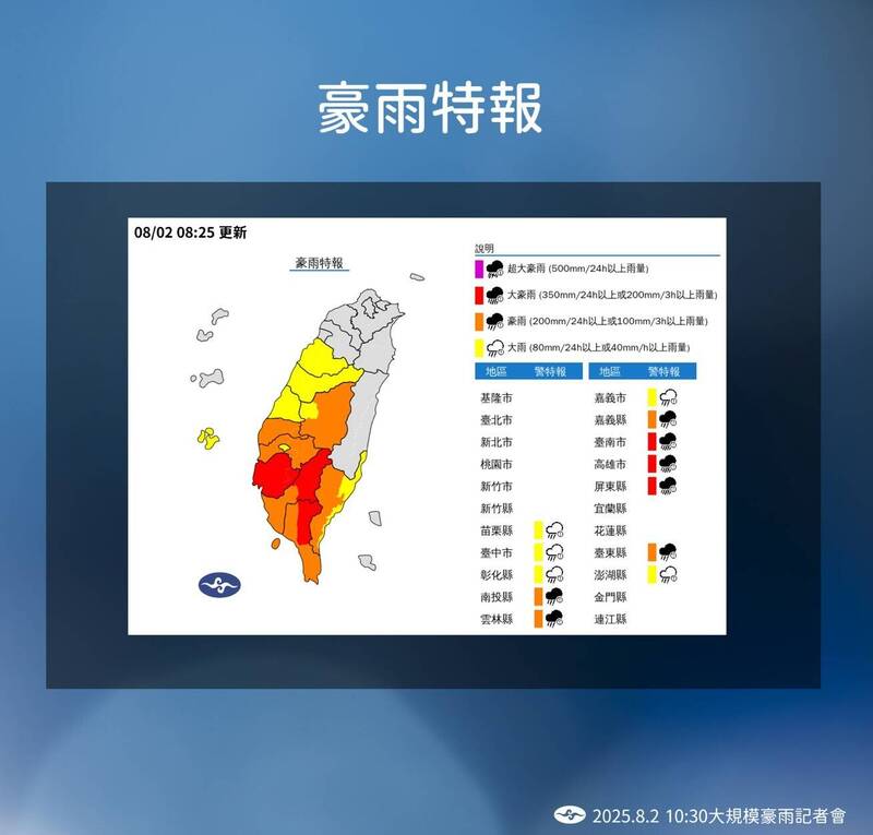 今天(2日)西南風又增強,苗栗以南地區注意大雨、豪雨!中央氣象署在上午針對0728西南氣流豪雨事件記者會說明,台南、高雄、屏東山區更要注意大豪雨,今天台南甚至出現時雨量破100毫米,以達到短延時大豪雨等級。