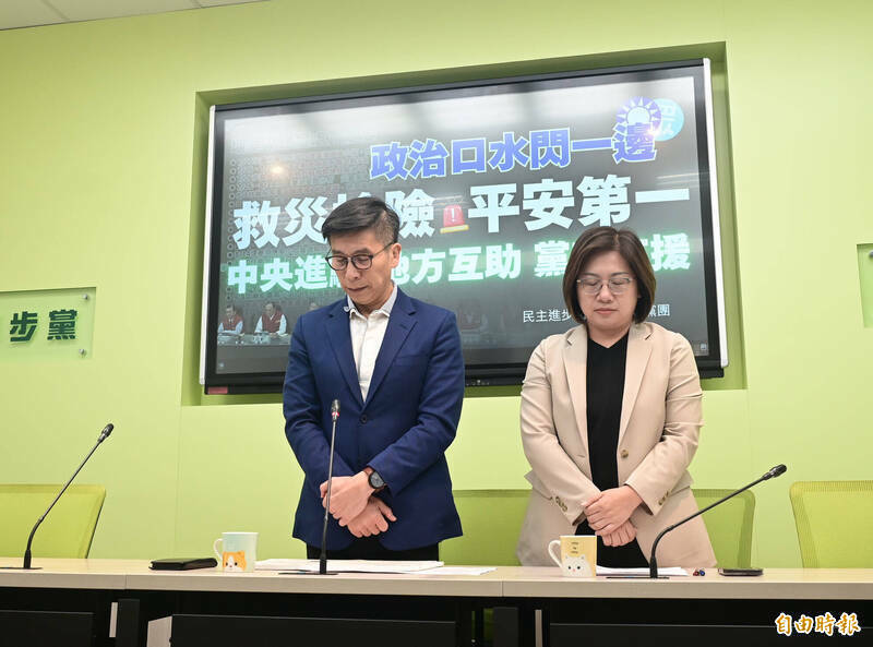 立法院民進黨團今召開「政治口水閃一邊 救災搶險 平安第一」記者會,會前首先哀悼罹難者。(記者王藝菘攝)