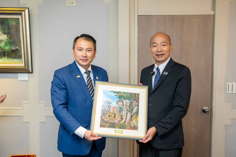 立法院長韓國瑜(右)與總會長陳智敏(左)互贈紀念品。(立法院提供)