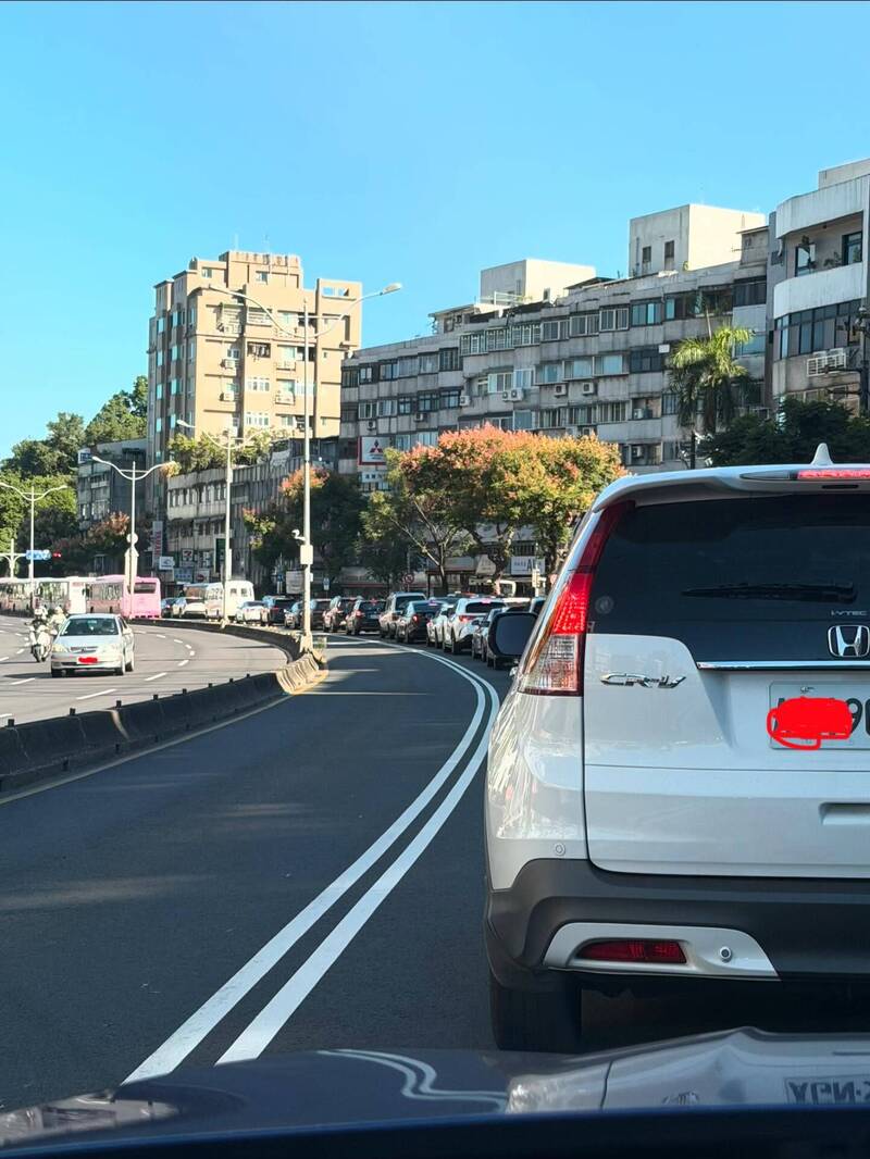 另一名網友則表示早上8點經過時車不算多,原Po則分析,「感覺是一陣一陣,只要前面交通指揮不好(自己不負責算了一下大約14個指揮交通人員)或者突然公車變多,再或者改道的人突然不改,就塞起來。自己體感是機車會往中間,加上公車也在地面,然後汽車又在外側三道,其實體感更加危險…。」並感嘆,令人失望的是,長時間都走那條路,本來不需要等3至4個紅綠燈,現在卻要,改走水源那邊也是車變多」。
