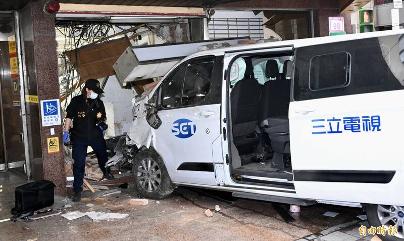 三立新聞台一輛採訪車今日下午行經台北市中山區一江街與南京東路口時,因不明原因突然失控衝進路口的彰化銀行內。(記者鄭景議翻攝)