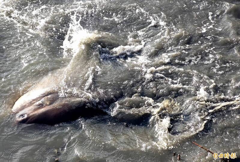 俗稱「翻車魚」的曼波魚今(5日)下午擱淺在關渡碼頭。(記者陳逸寬攝)