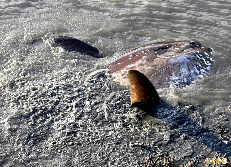 5日下午,有民眾在關渡碼頭岸邊發現一隻疑似海豚的生物擱淺。隨著潮水逐漸退去,仔細查看後,確認為曼波魚(俗稱翻車魚),這回真的意外「翻車」。