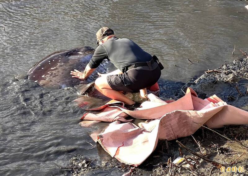 台北市北投區關渡碼頭今(5日)下午發生俗稱「翻車魚」的曼波魚擱淺事件,所幸在熱心民眾與動物救援隊合力協助下,成功將魚隻送回水中。
