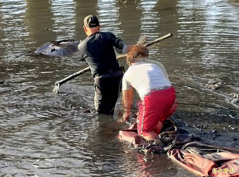 熱心民眾深入泥沼救援「翻車魚」。(記者陳逸寬攝)