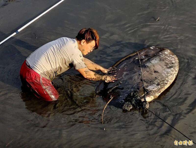 現場兩名熱心民眾嘗試將翻車魚推回海裡,無奈魚體重約60至70公斤,且深陷泥沼,兩人弄得滿身泥濘仍無法移動。隨後動物救援隊趕抵現場,利用纜繩固定魚體,眾人合力連拖帶拉,最終順利完成救援。