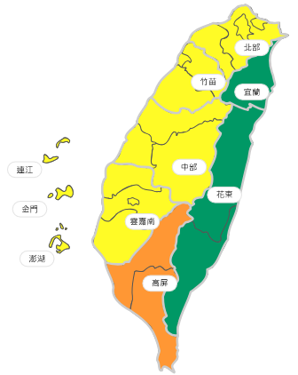 紫外線指數方面,週四新北、台北、基隆、桃園、新竹、苗栗、宜蘭、澎湖、金門、連江為「中量級」;其餘縣市則皆為「高量級」。