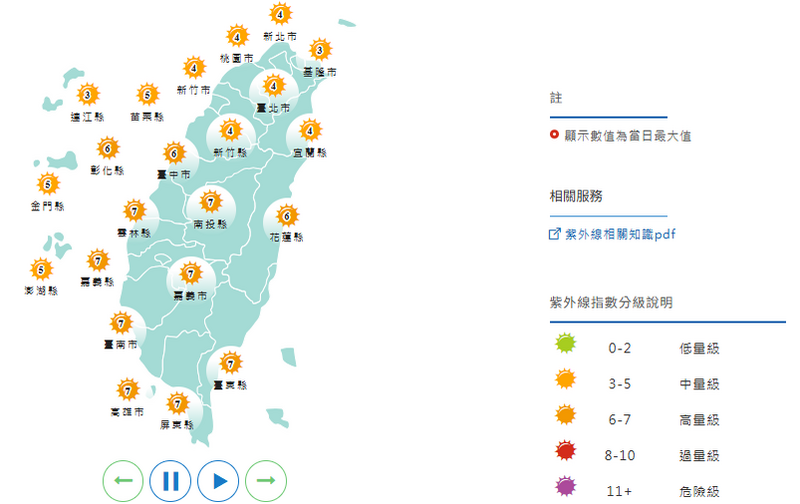 週四的紫外線指數,新北、台北、基隆、桃園、新竹、苗栗、宜蘭、澎湖、金門、連江為「中量級」;其餘縣市則皆為「高量級」。(擷取自中央氣象署網站)