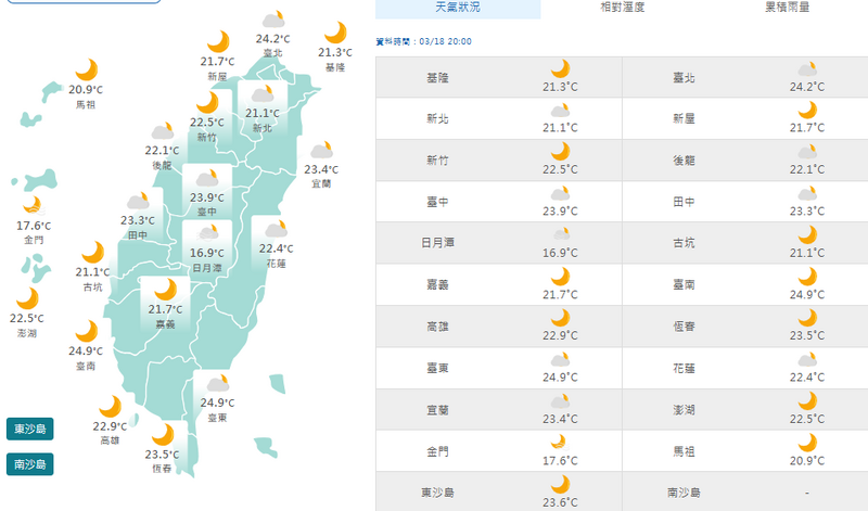 週四桃園以北、東半部地區、恆春半島及竹苗山區有不定時的局部短暫陣雨,中南部山區午後則有零星短暫陣雨,其他地區為多雲到晴。(擷取自中央氣象署網站)