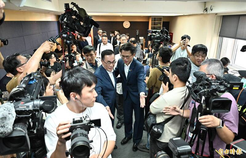 藍白新北市長民調今公佈,由國民黨新北市長參選人李四川(右)勝出。被問到是否延攬黃國昌加入競選團隊或是未來當選後的小內閣,李表示,黃國昌一定是他最好的戰友,假設他當選,人才一定是共治,針對民眾黨的人才,他會努力來延攬。(記者劉信德攝)