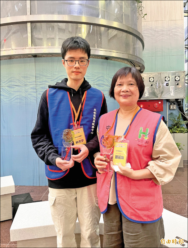 獲得志工楷模金牌獎的連麗珠(右)已服務超過1.1萬小時,年僅20歲的林杰宇,利用課餘時間擔任志工,獲表揚學生志工楷模獎。(記者蔡思培攝)