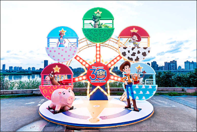 延平河濱公園設主題裝置,有「玩具總動員」人氣角色胡迪的摩天輪。(台北市觀傳局提供)