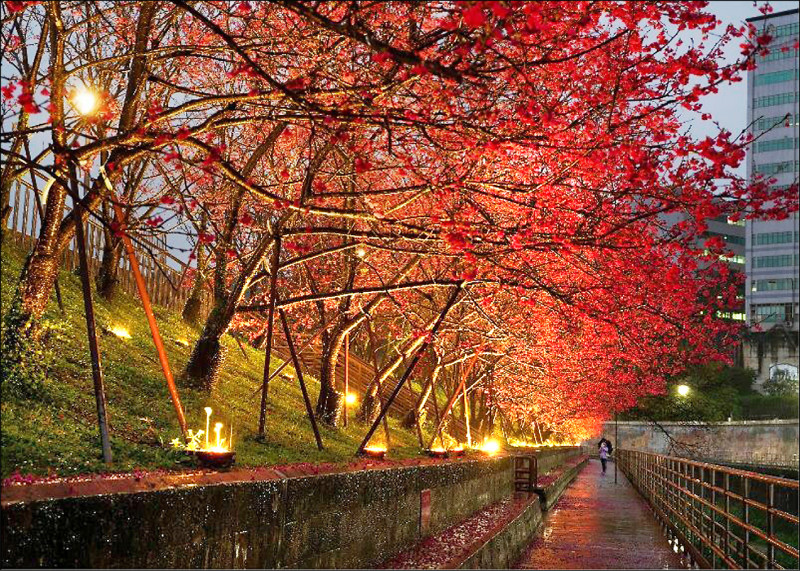 內湖樂活夜櫻燈下風情充滿層次感。 (北市公園處提供)