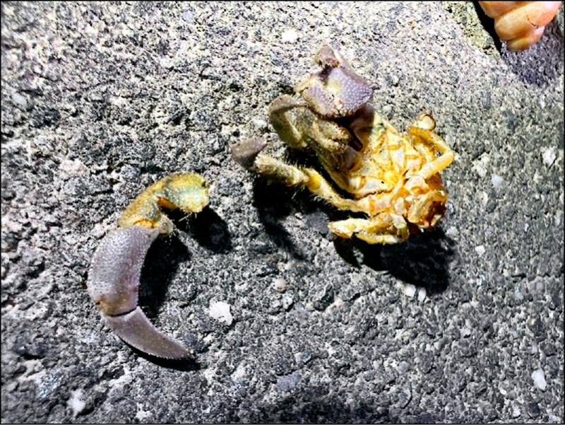 食蟹獴被拍到咬蟹殼、摔蟹或破壞殼後再啃食。(東管處提供)