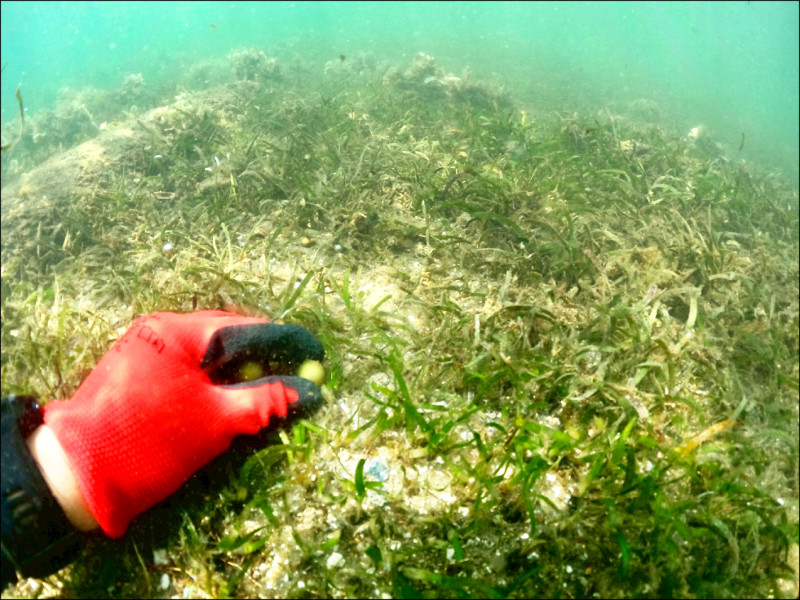 水產試驗所東部中心主任何源興和好好善待動物協會處長黃宣穎共同簽署攜手推動台灣本島海草復育計畫,在昨天「世界地球日」前,於富山漁業資源保育區共種下千顆海草種子。專家表示,因自然環境關係,海草在台東只出現在富山、綠島一帶,期盼未來能在當地成功種出大片海草原。